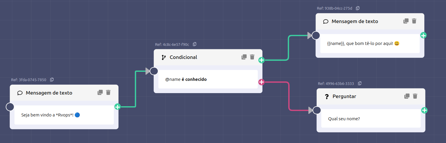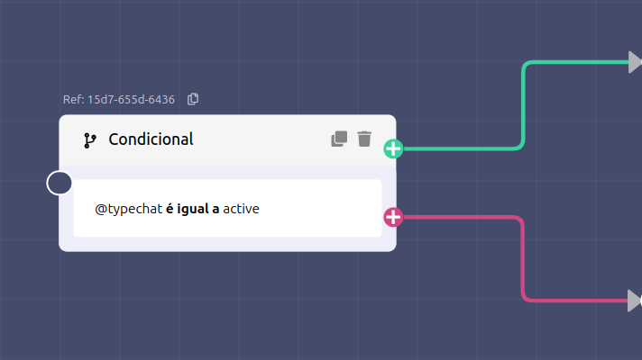 As condicionais possuem dois tipos de saídas, sendo uma positiva (verde) e outra negativa (vermelho). E a partir disso, serão direcionados conforme a condição descrita na ação.