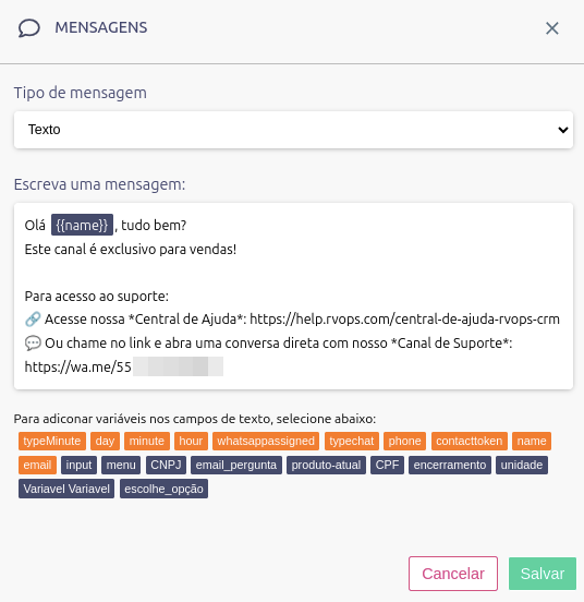 A ação de envio de mensagem pode ser adicionada em qualquer momento do fluxo do chatbot sem limitação de tamanho ou formatação. Nela você pode utilizar: