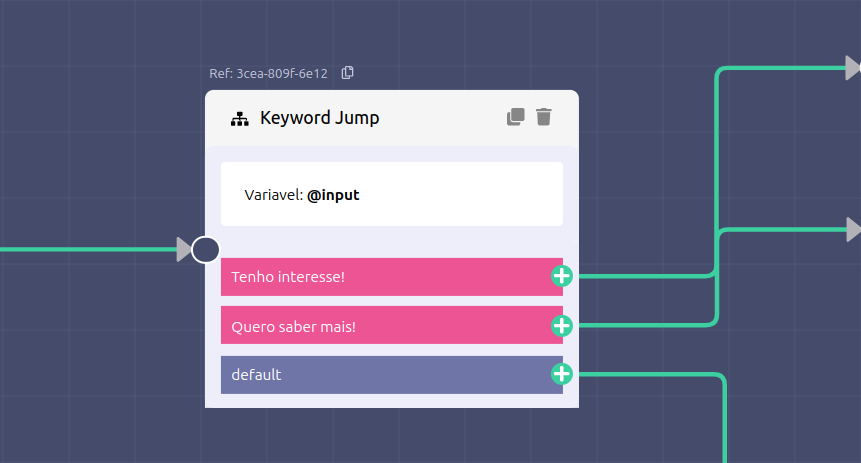 Após criar um fluxo de automação, caso deseje direcionar todos os contatos que interagirem com essa campanha independente da resposta para um fluxo específico, é possível configurar através do **Keyword Jump**, utilizando a variável **workflowid** e incluindo os respectivos ID's.