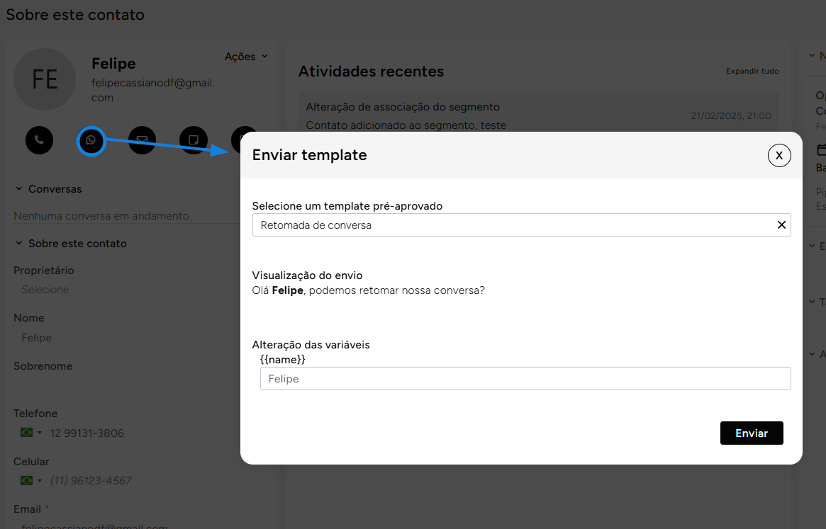 A mensagem enviado será automaticamente registrada nas atividades recentes do contato e qualquer erro de envio poderá também ser visualizado no registro.&#x20;