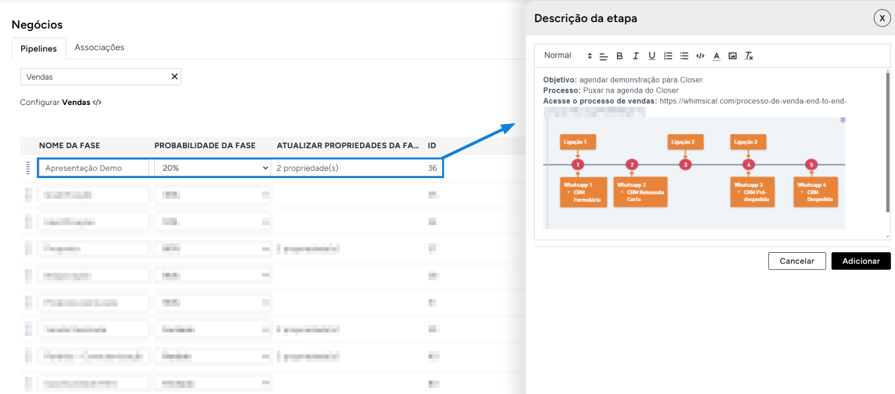 Além de personalizar as informações exibidas nos cards, você também pode adicionar **descrições detalhadas para cada etapa do funil**. Isso ajuda os usuários a entenderem claramente o **significado de cada etapa e fornece orientações sobre como realizar as movimentações de forma correta**.