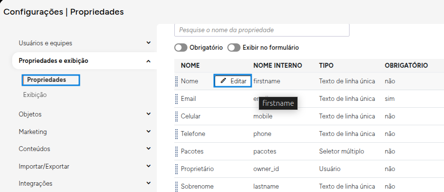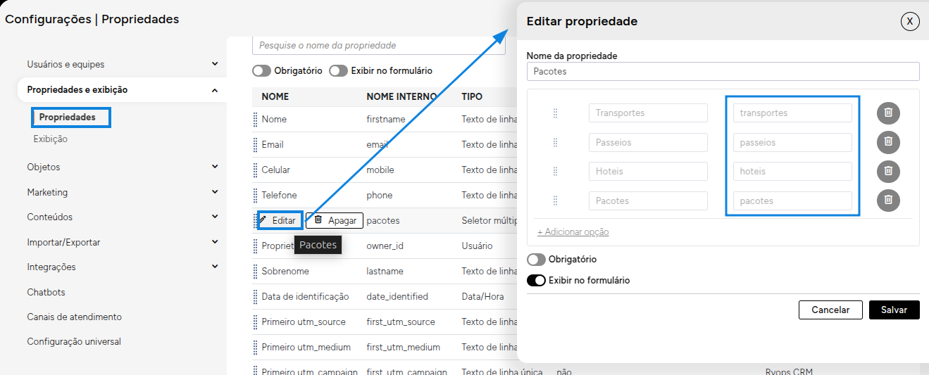 As propriedades obrigatórias tanto para criação como para atualização serão exibidas logo acima. Elas estão ligadas as configurações de obrigatoriedade e identificador único presentes nas configurações gerais da conta: [propriedades](https://help.rvops.com/central-de-ajuda-rvops-crm/conta-e-configuracao/propriedades "mention")