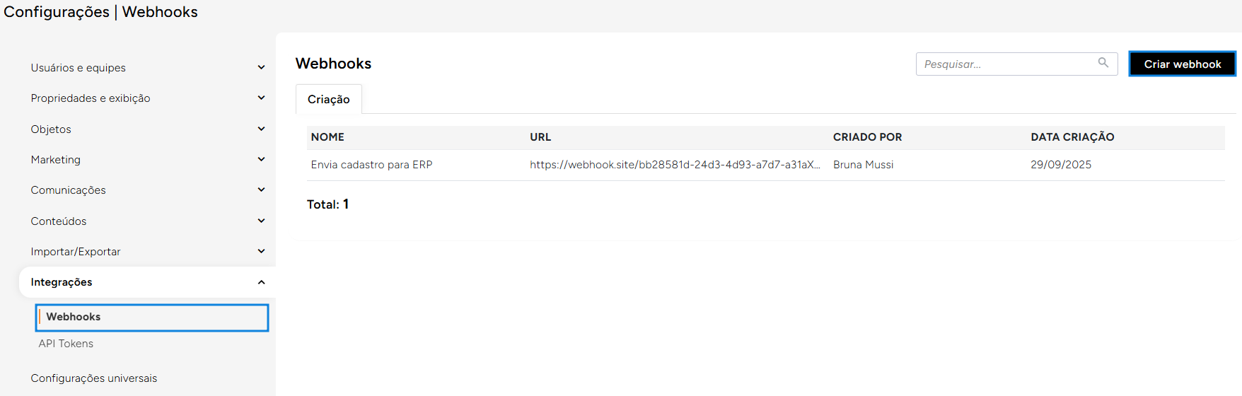1. Acesse **Configurações > Integrações > Webhooks**.