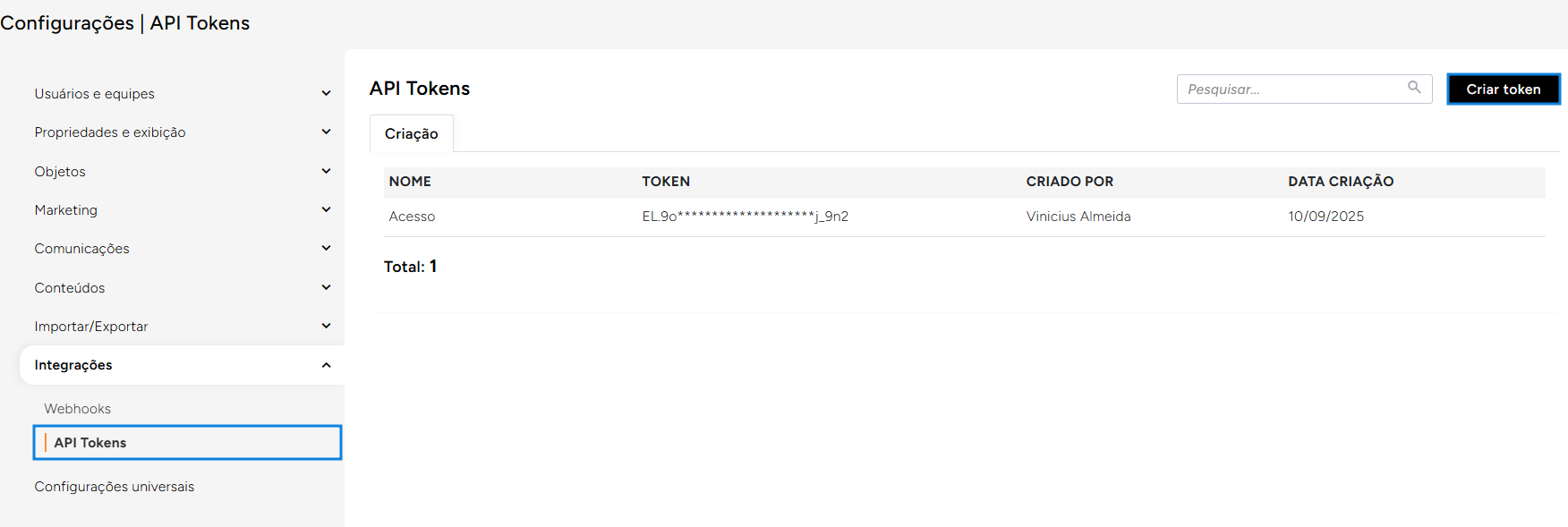 1. Acesse **Configurações > Integrações > API Tokens**.