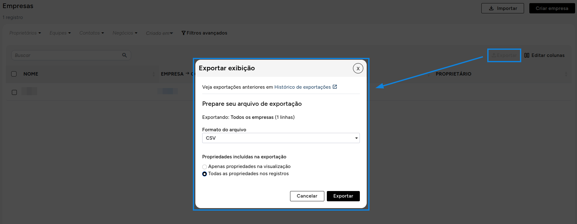 Ao exportar empresas, você pode optar entre baixar **todos os campos** de propriedades disponíveis para o objeto “**Empresa**” ou apenas os **campos personalizados** selecionados para exibição na listagem.