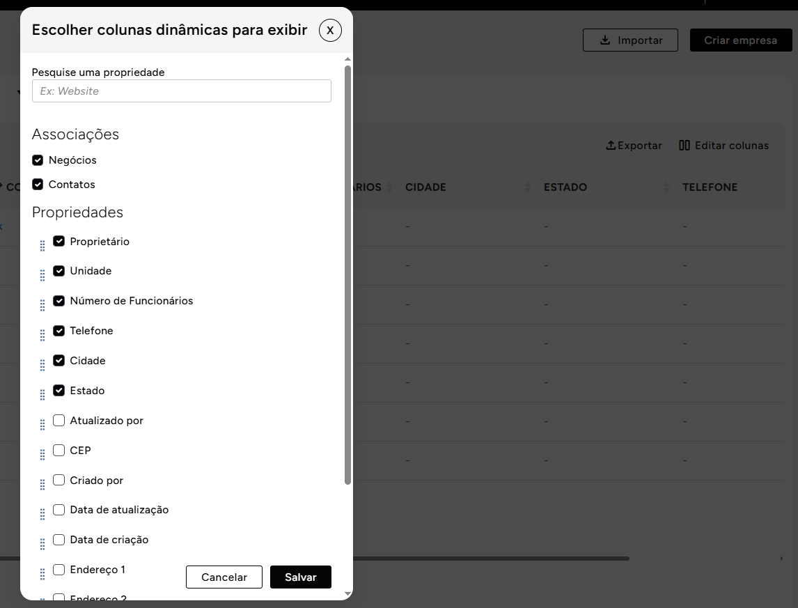 Você pode **personalizar a exibição** das informações na lista de empresas, escolhendo quais campos devem aparecer e definindo a ordem das colunas. Para isso, basta clicar em **“Editar Colunas”** e ajustar de acordo com suas preferências.