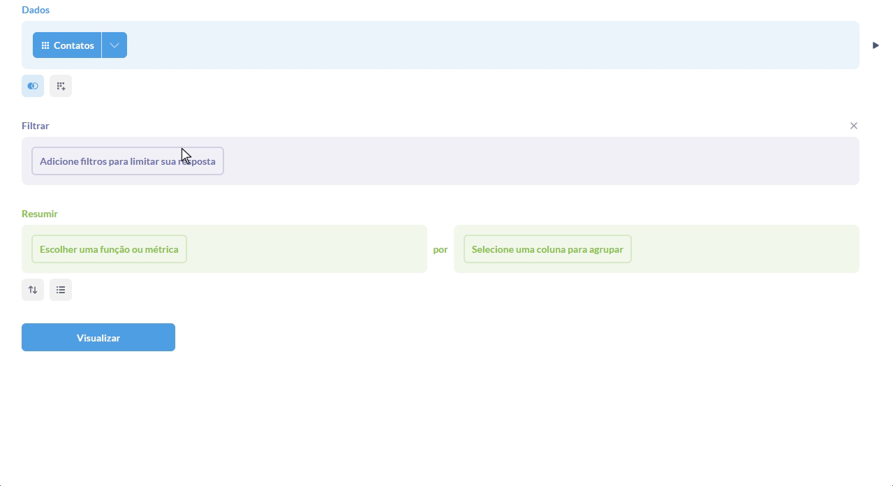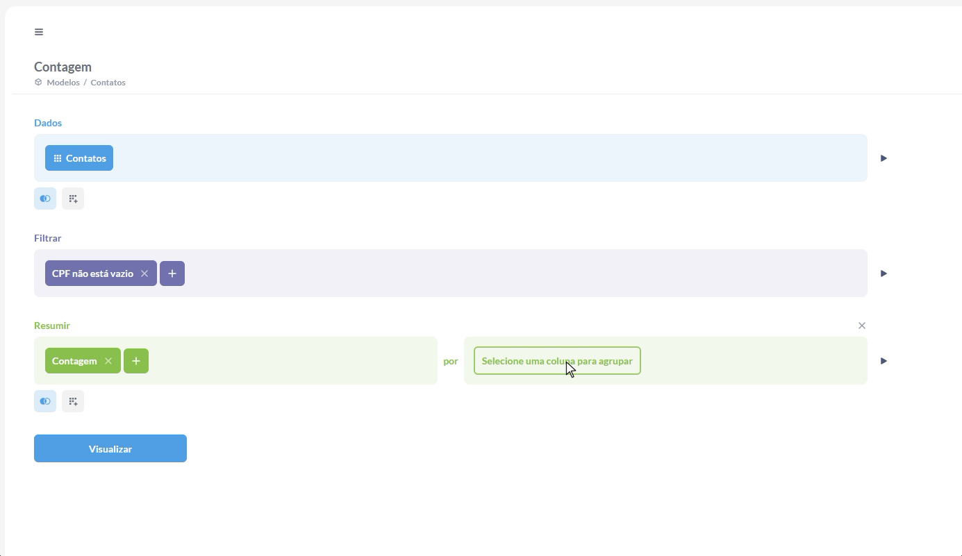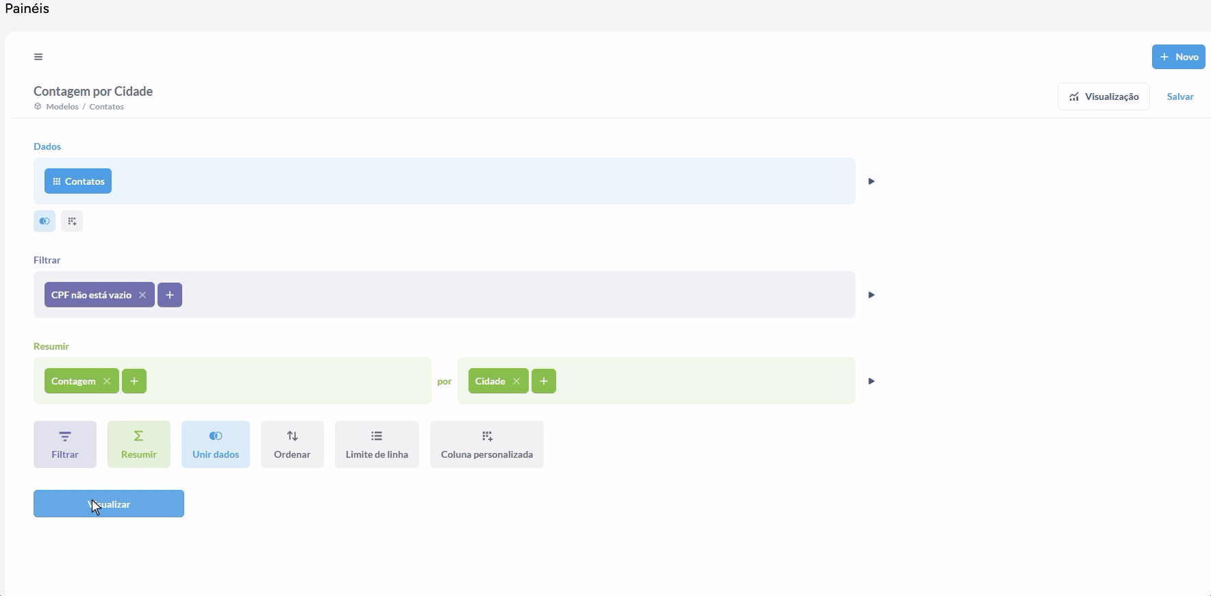 Nos exemplos dos passos acima, criamos uma pergunta onde filtramos os contatos que possuem CPF preenchida e agrupamos por cidade.&#x20;