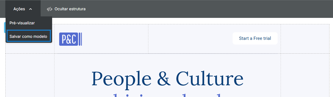 Em exibir estrutura é possível validar todo o esqueleto de linhas e conteudos atualmente existentes no construtor. Assim você consegue realizar qualquer ajuste necessário para padronização.