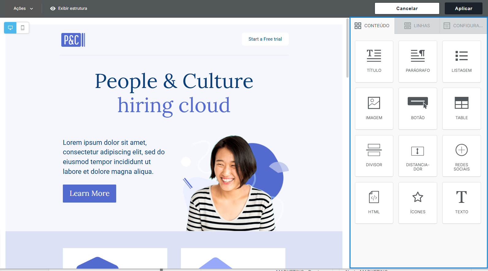 Do lado esquerdo é possível ver todo a parte visual do e-mail e realizar os ajustes necessários linhas e conteúdos, estas ferramentas são acessadas ao lado direito do visor.