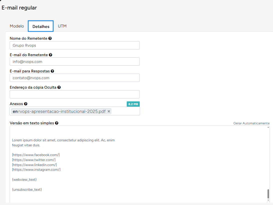 * **Anexos:** Anexe arquivos já previamente salvos no CRM ([Relembre aqui como](https://help.rvops.com/central-de-ajuda-rvops-crm/marketing/arquivos));