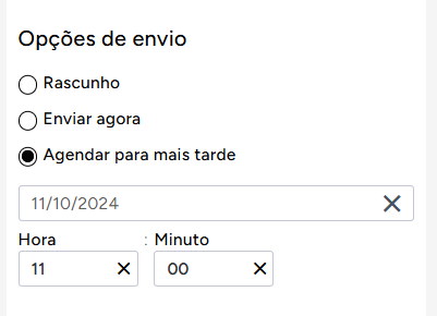 Em caso de e-mail regular, é possível definir se o envio será imediato ou agendado para uma data e horário especificos.&#x20;