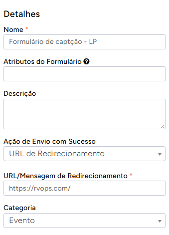 Para finalizar, os detalhes do formulário permite não somente configurações para referencia interna, como nome e categoria - **Mas também demais ações de funcionamento.**&#x20;