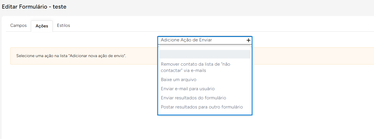 Na aba "**Ações**" expanda as possibilidades após a submissão do formulário. Aqui é possível gerar algumas ações de forma automática após cada envio.&#x20;