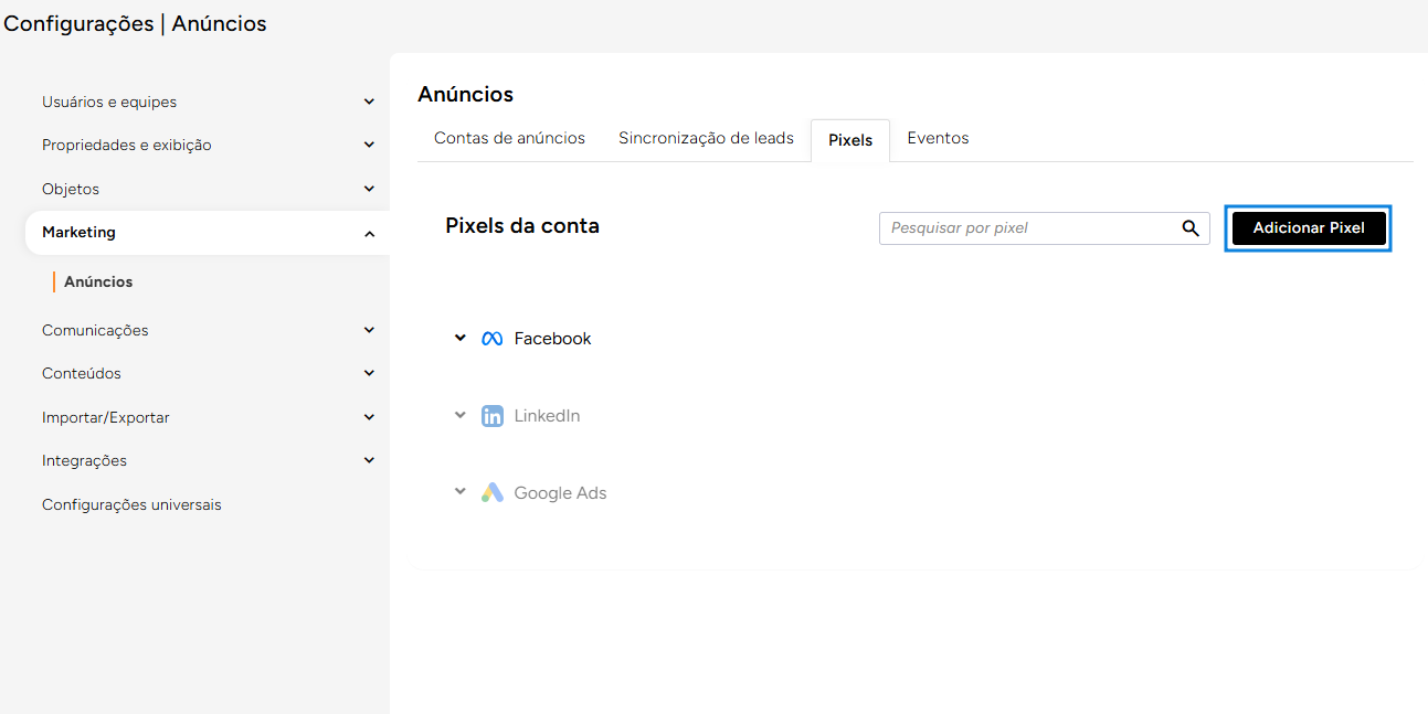 Acesse **Configurações → Anúncios → Pixel** e clique em **Adicionar Pixel**.