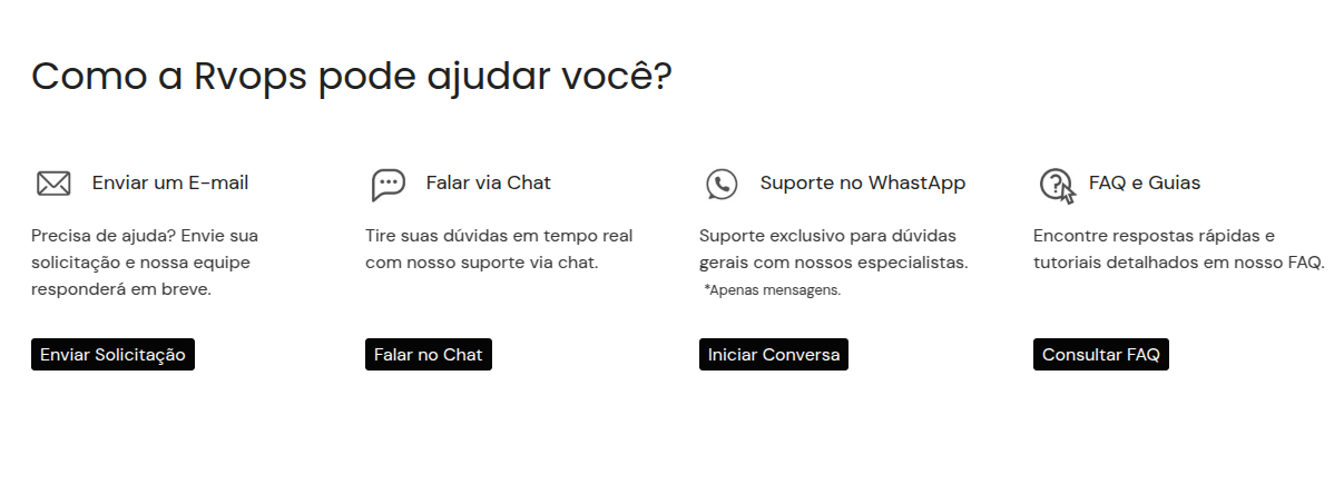 Selecione se deseja suporte via **E-mail - Chat - Whatsapp** ou acessar nosso **FAQ e Guias.**