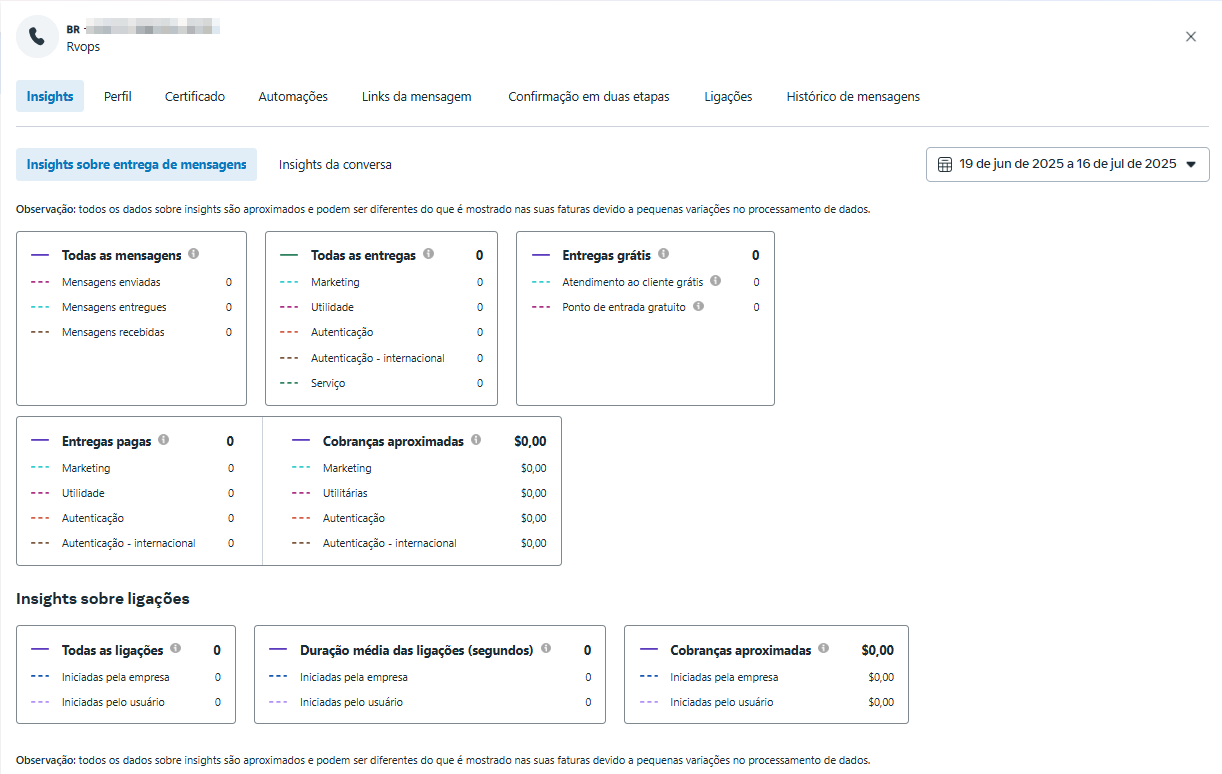**1.5** Na aba [Visão geral](https://business.facebook.com/wa/manage/home/?business_id=696636657357749\&waba_id=101031139272850), encontre a seção Insights deste mês e clique no tipo de insight de conversa que você deseja visualizar.